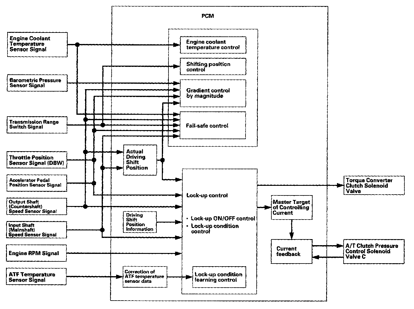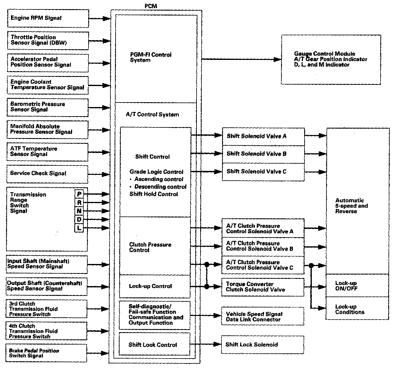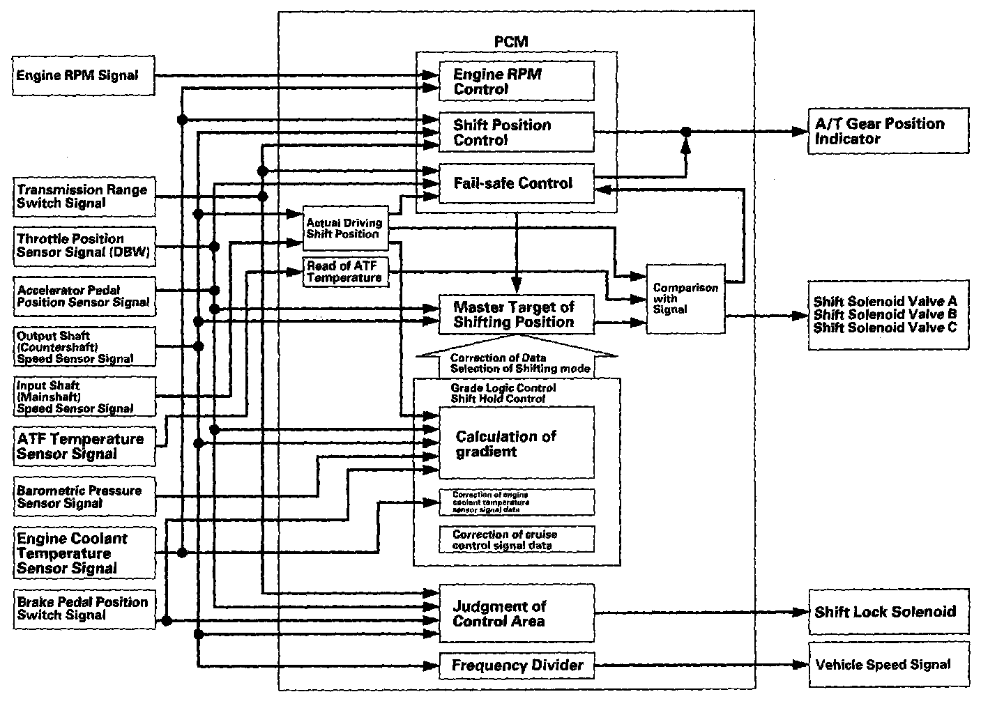 The PCM receives input signals from the sensors, switches, and other control units, perform processing data, and outputs signals for the engine control system and A/T control system. The A/T control system includes shift control, grade logic control, clutch pressure control, and lock-up control is stored in the PCM. The PCM switches the shift solenoid valves and the A/T clutch pressure control solenoid valves to control shifting transmission gears and lock-up torque converter clutch.