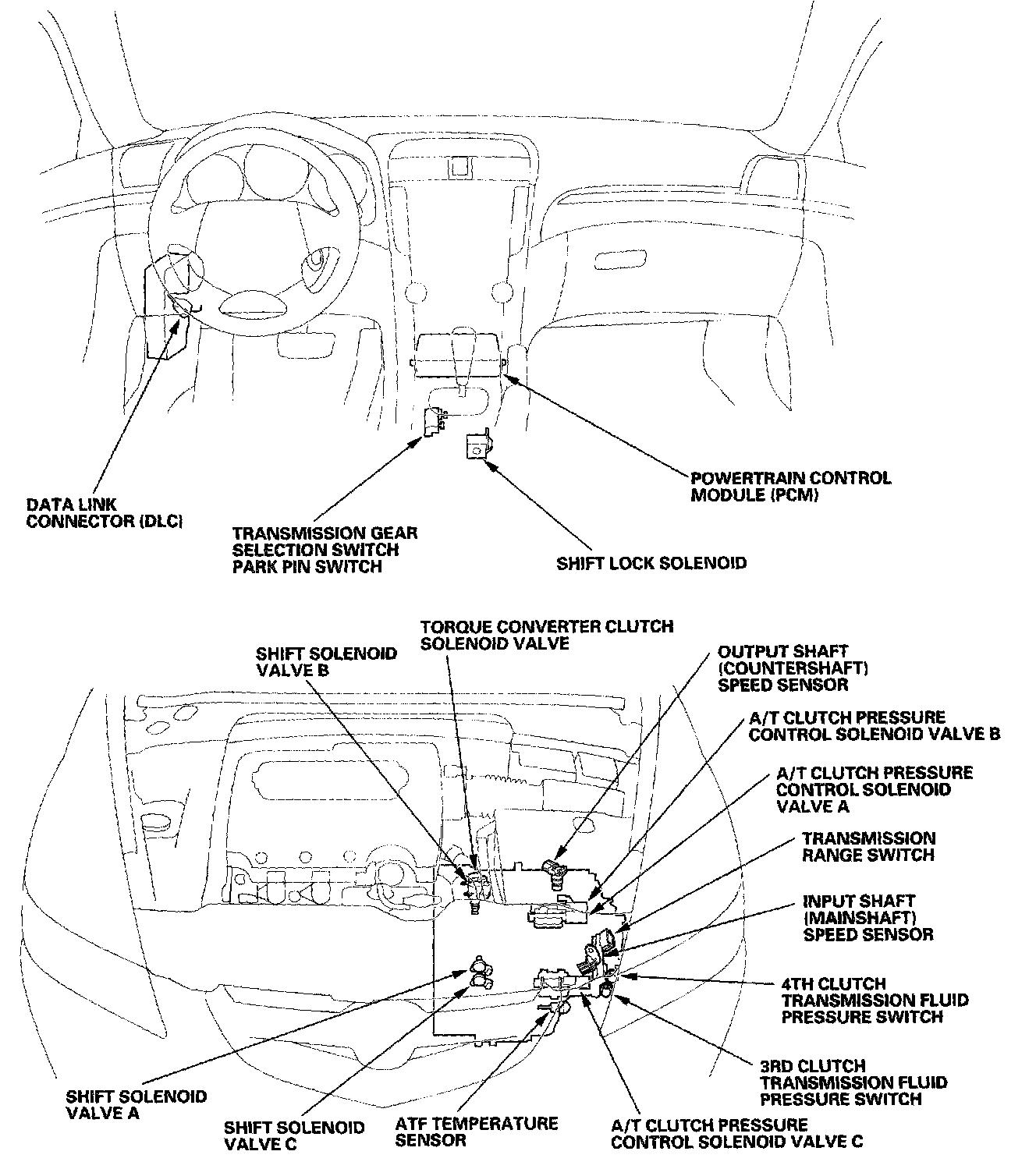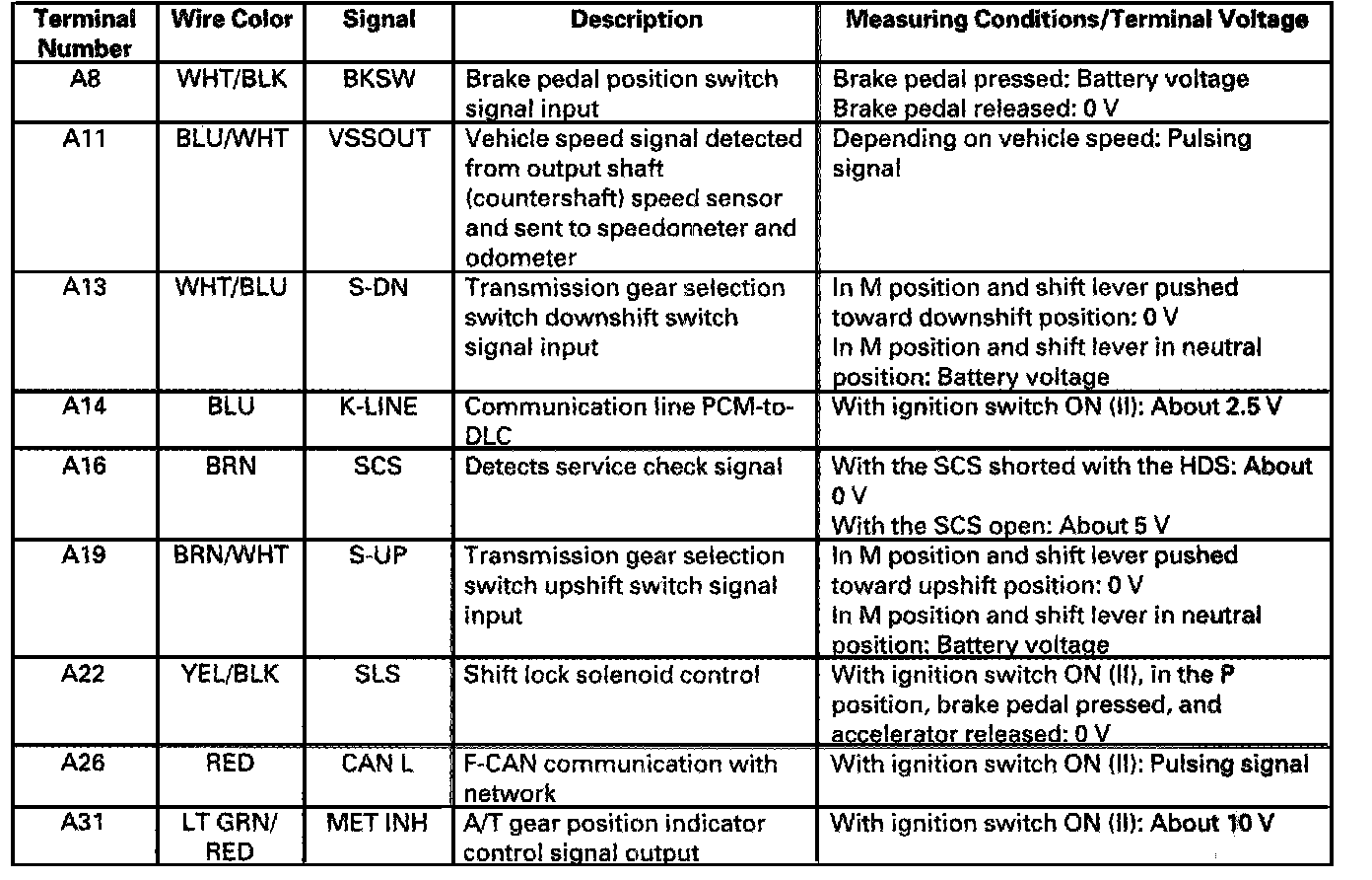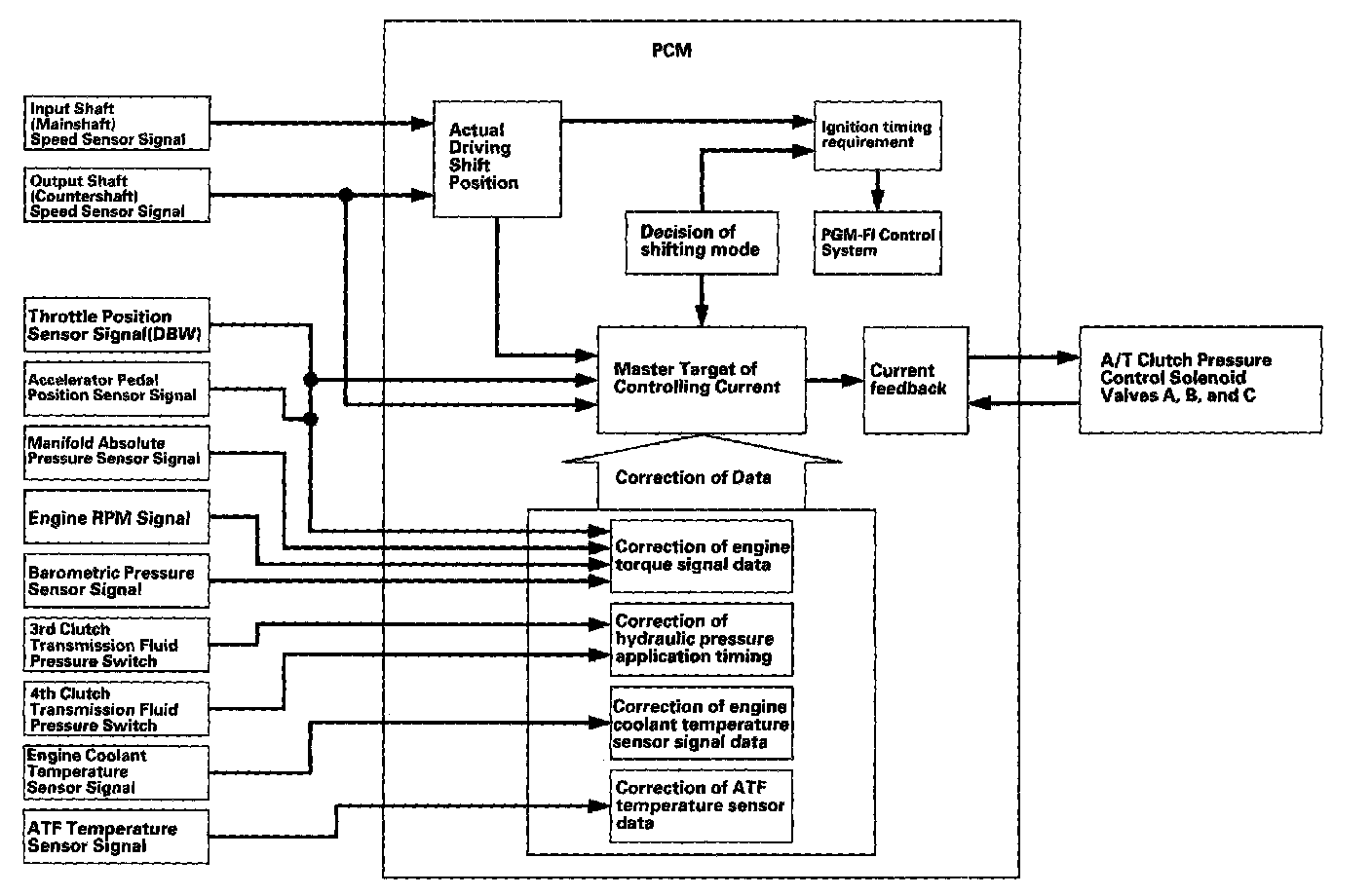 The PCM receives input signals from the sensors, switches, and other control units, perform processing data, and outputs signals for the engine control system and A/T control system. The A/T control system includes shift control, grade logic control, clutch pressure control, and lock-up control is stored in the PCM. The PCM switches the shift solenoid valves and the A/T clutch pressure control solenoid valves to control shifting transmission gears and lock-up torque converter clutch.