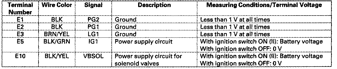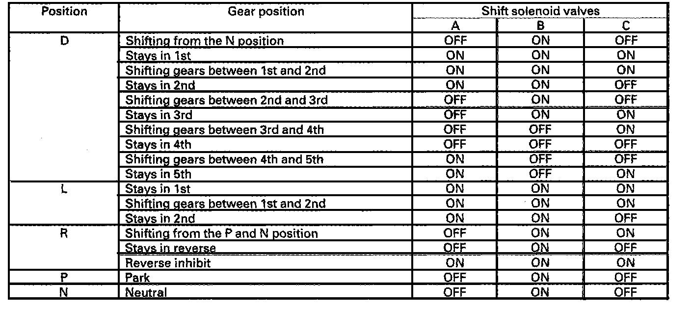 The PCM turns on and off the shift solenoid valves A, B, and C to control shifting of the transmission gears. The combination of driving signals to shift solenoid valves A, B, and C are shown in the table.
