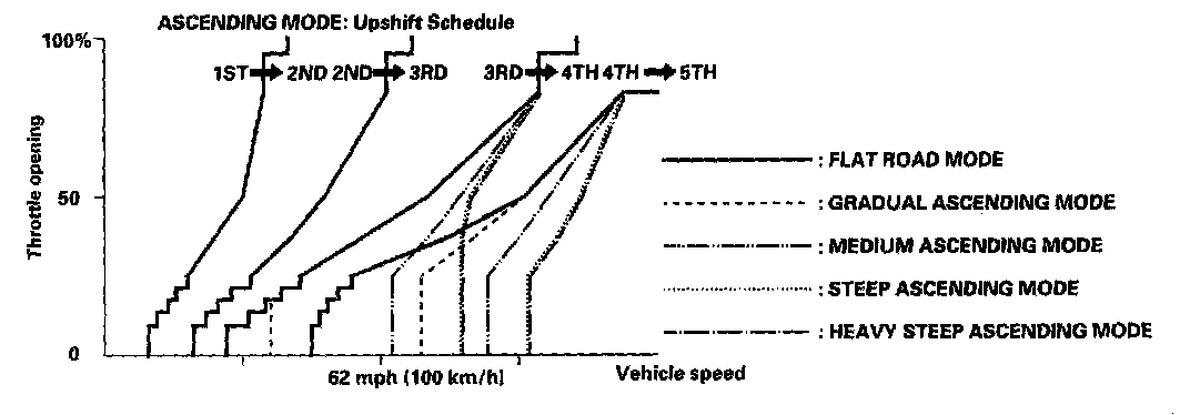 When the PCM determines that the vehicle is climbing a hill in the D position, the system extends the engagement area of 2nd gear, 3rd gear, and 4th gear to prevent the transmission from frequently shifting between 2nd and 3rd gears, between 3rd and 4th gears, and between 4th and 5th gears, so the vehicle can run smooth and have more power when needed.