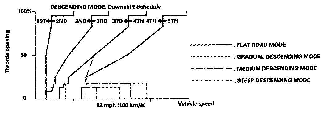 When the PCM determines that the vehicle is going down a hill in the D position, the shift-up speed from 4th to 5th gear, 3rd to 4th gear, and from 2nd to 3rd (when the throttle is closed) becomes faster than the set speed for flat road driving to widen the 4th gear, 3rd gear, and 2nd gear driving areas. This, in combination with engine braking from the deceleration lock-up, achieves smooth driving when the vehicle is descending. There are three descending modes with different 4th gear driving areas, 3rd gear driving areas and 2nd gear driving areas according to the magnitude of a gradient stored in the PCM. When the vehicle is in 5th or 4th gear and you are decelerating while applying the brakes on a steep hill, the transmission will downshift to a lower gear. When you accelerate, the transmission will then return to a higher gear.