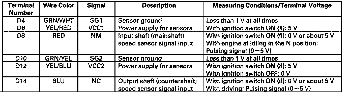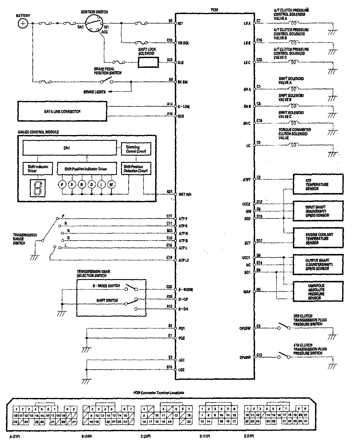 Also, as grade logic control system and shift hold control system have been adopted to control shifting in the D position. The PCM compares actual driving conditions with memorized driving conditions, based on the input from the throttle position sensor, the engine coolant temperature sensor, the barometric pressure sensor, the brake pedal position switch signal, and the shift lever position signal, to control shifting while the vehicle is ascending or descending a slope.