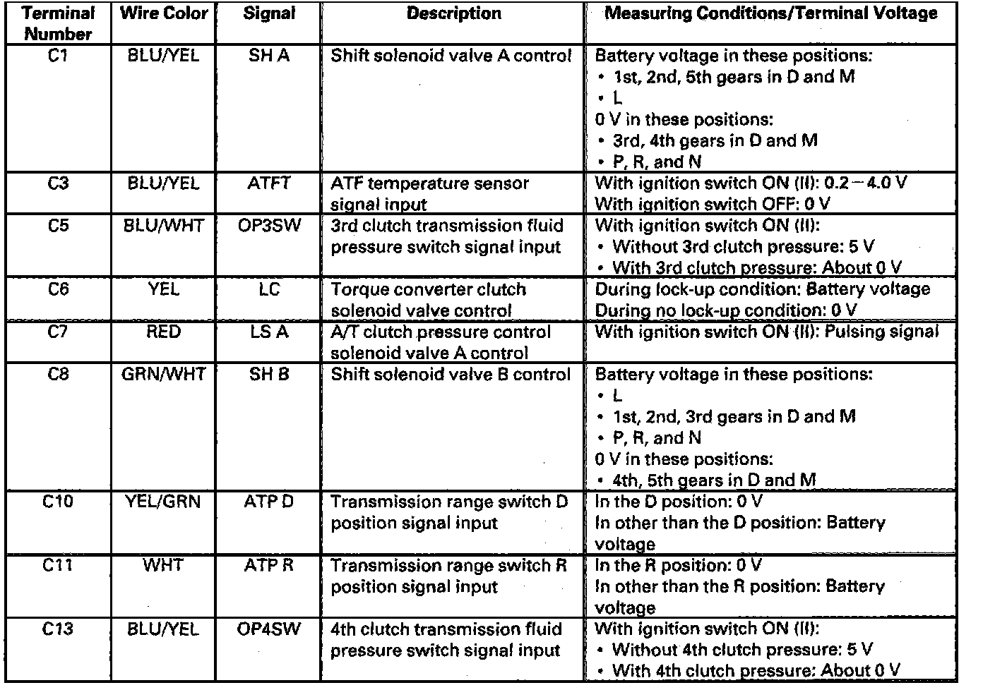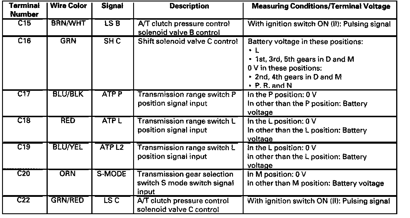 The PCM receives input signals from the various sensors and switches, performs processing data, and outputs a current to the A/T clutch pressure control solenoid valves A, B, and C.