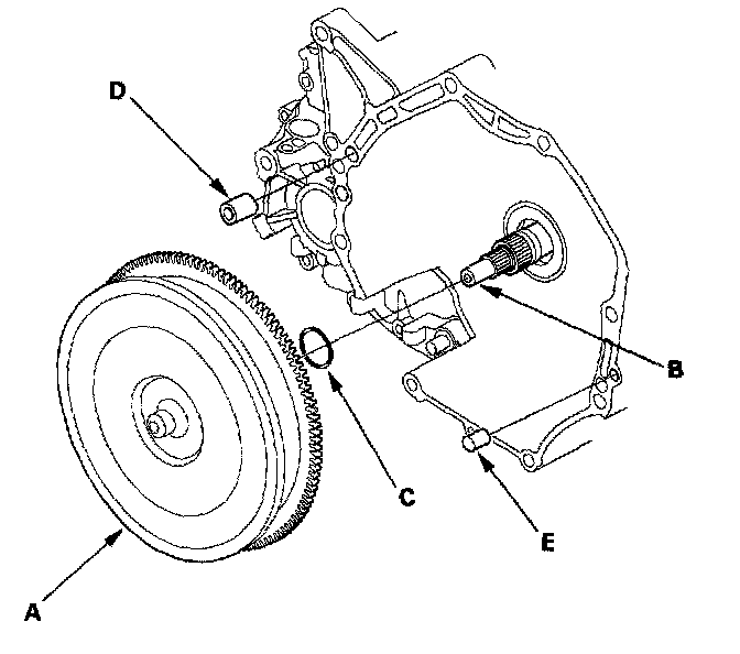 3. Install the 14 x 20 mm dowel pin (D) and 10 x 20 mm dowel pin (E) in the torque converter housing.
