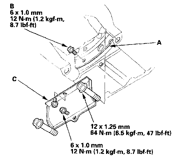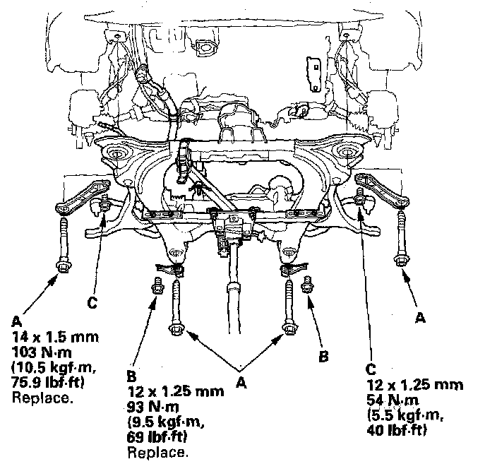 18. Loosely install the new subframe mounting bolts (A), and new rear stiffener mounting bolts (B), and the front stiffener mounting bolts (C).