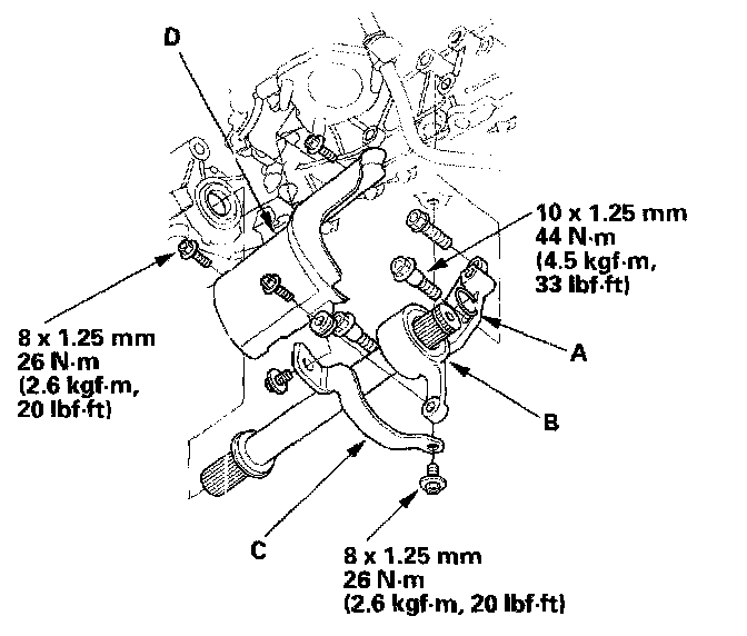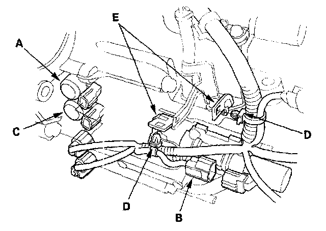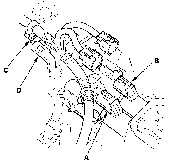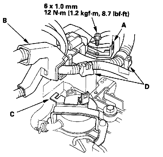 43. Connect the output shaft (countershaft) speed sensor connector (A), and install the harness clamps (B) on the brackets. Connect the vacuum hose (C) to the vacuum line (D).