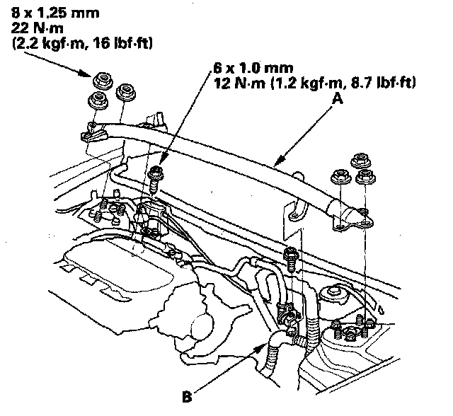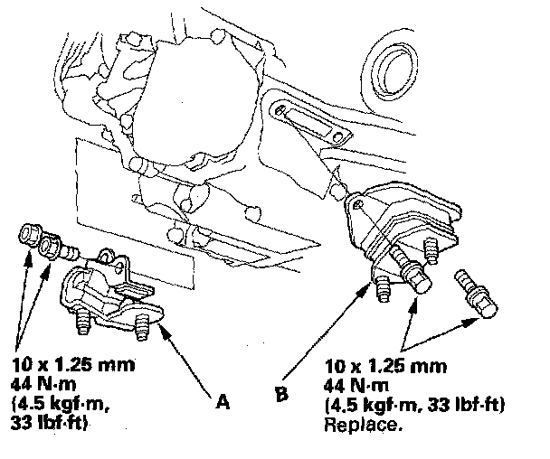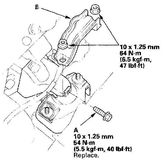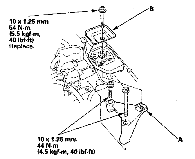 16. Install the transmission lower rear mount (B) with the new bolts.