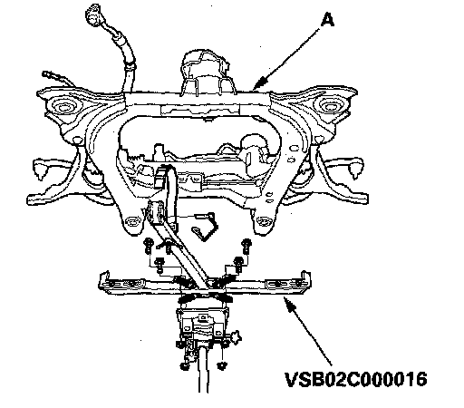 17. Support the front subframe (A) with the special tool and a lack, and lift it up to body.
