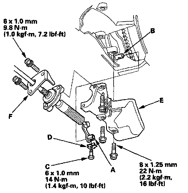 28. Install the shift cable cover (E), then secure the shift cable holder (F) on the cover with the bolts.