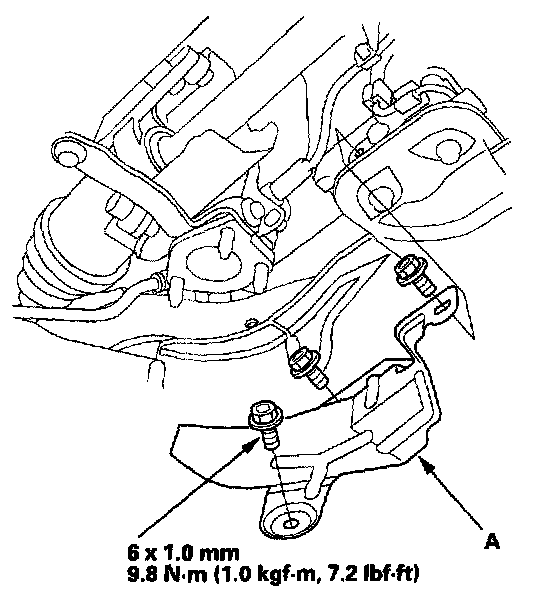 50. Install the transmission upper mount bracket (A) on the transmission with two bolts.