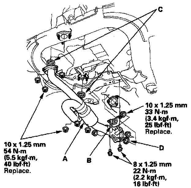 13. Install the exhaust manifold bracket (C) and heat shield (D).