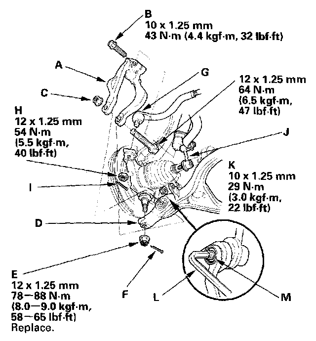 33. Install the stabilizer links (J) to the lower arms, and install the nuts (K). Insert a 6 mm Allen wrench (L) in the ball joint (M), and tighten the nuts.