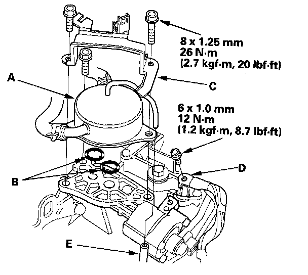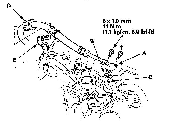 53. Insert the power steering pump outlet fine (A) with a new O-ring (B) to the pump (C). and install the hose (D) in its clamp (E).