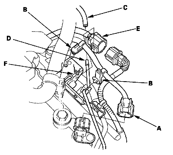 49. Connect the transmission subharness connector (E), then install it on its bracket (F).