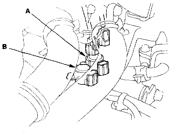 45. Connect the connectors to the torque converter clutch solenoid valve (A) and shift solenoid valve B.