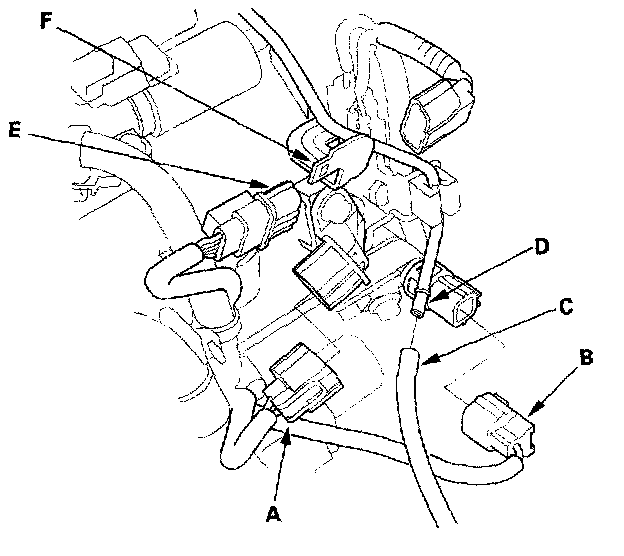 48. Connect the input shaft (mainshaft) speed sensor connector (A) and 4th clutch transmission fluid pressure switch connector (B), and connect the vacuum hove (C) to the vacuum line (D).