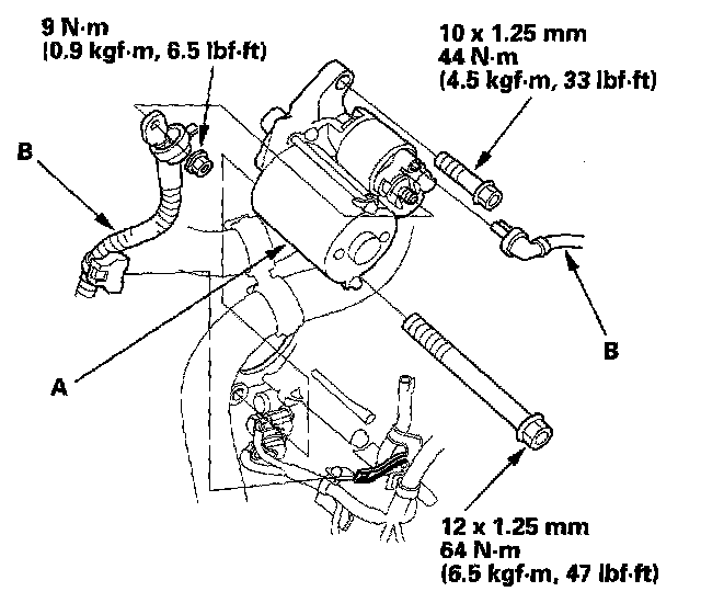 10. Attach the torque converter to the drive plate (A) with eight bolts (B).Rotate the crankshaft pulley as necessary to tighten the bolts to 1/2 of the specified torque, then to the final torque, in a crisscross pattern. After tightening the last bolt, check that the crankshaft rotate freely.