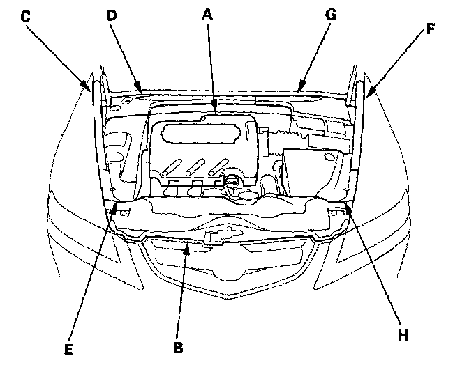 68. Install the covers in the order presented; intake manifold cover (A), front bulkhead cover (B), left fender trim (C), right rear engine compartment cover (D), right side engine compartment cover (E), right fender trim (F), left rear engine compartment cover (G), and left side engine compartment cover (H).
