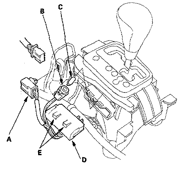 4. Remove the transmission gear selection switch/park pin switch (D) by releasing the lock tabs (E).