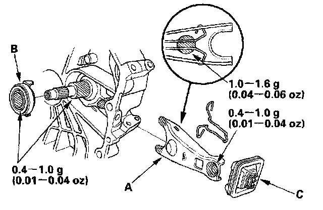 2. Apply super high temp urea grease (P/N 08798-9002) to the release fork (A) and the release bearing (B). Install the release fork, the release bearing, and the boot (C).