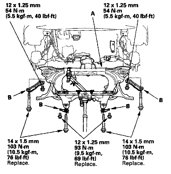 8. Install the front suspension subframe (A) and front suspension subframe stays (B).