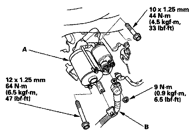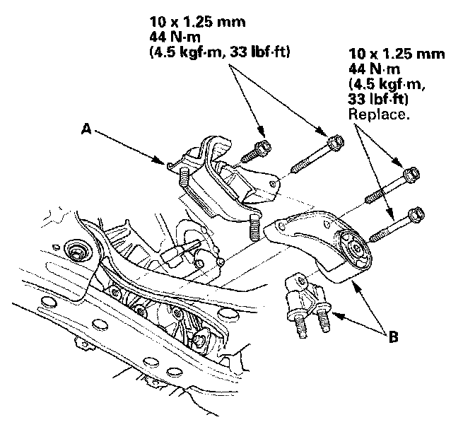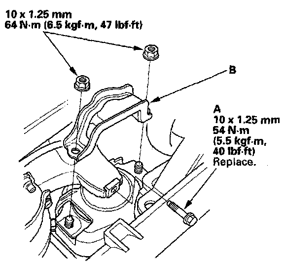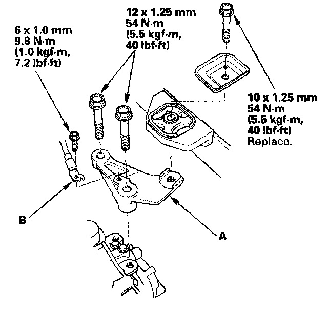 11. Install the transmission lower front mount (A) and the transmission lower rear mount (B).