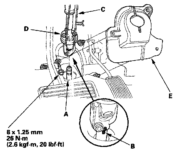 44. Install the power steering pump outlet line (A) with a new O-ring (B) to the pump (C), and install the hose (D) in its clamp (E).