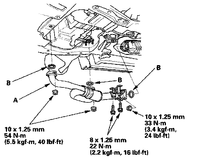 27. Install the exhaust pipe A and new gaskets (B).