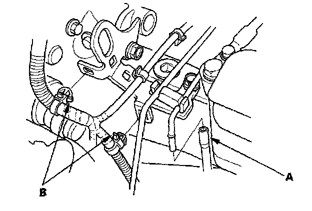 41. Connect the vacuum hose (A), then install the harness clips (B).