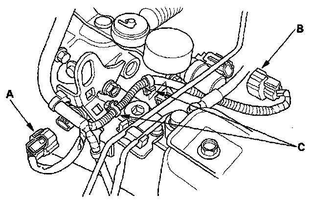 43. Connect the back-up light switch connector (A) and reverse lockout solenoid connector (B), then install the harness clips (C).