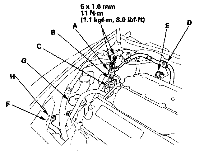 45. Connect the return the hose (F) to the power steering fluid reservoir (G), then secure the hose with its clamp (H).