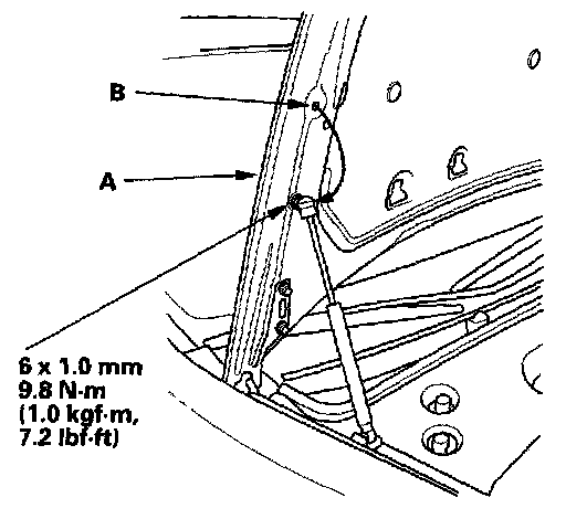 54. Disconnect the right side support strut from the pivot ball (bolted to the hood). Secure the hood (A) in a vertical position. Remove the right side pivot ball and install it into the upper threaded hole (B), then reattach the support struts.