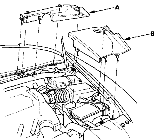 Back-up Light Switch Test1. Lay the fender cover over the fender, then remove the left rear engine compartment cover (A) and the left side engine compartment cover (B).