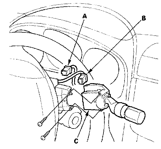 3. Disconnect the combination light switch 12P connector (A) and dashboard wire harness 8P connector (B) from the wiper/washer switch (C).