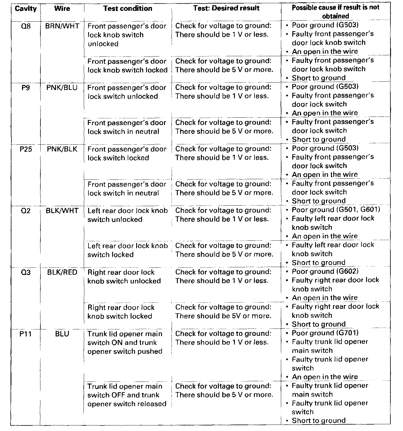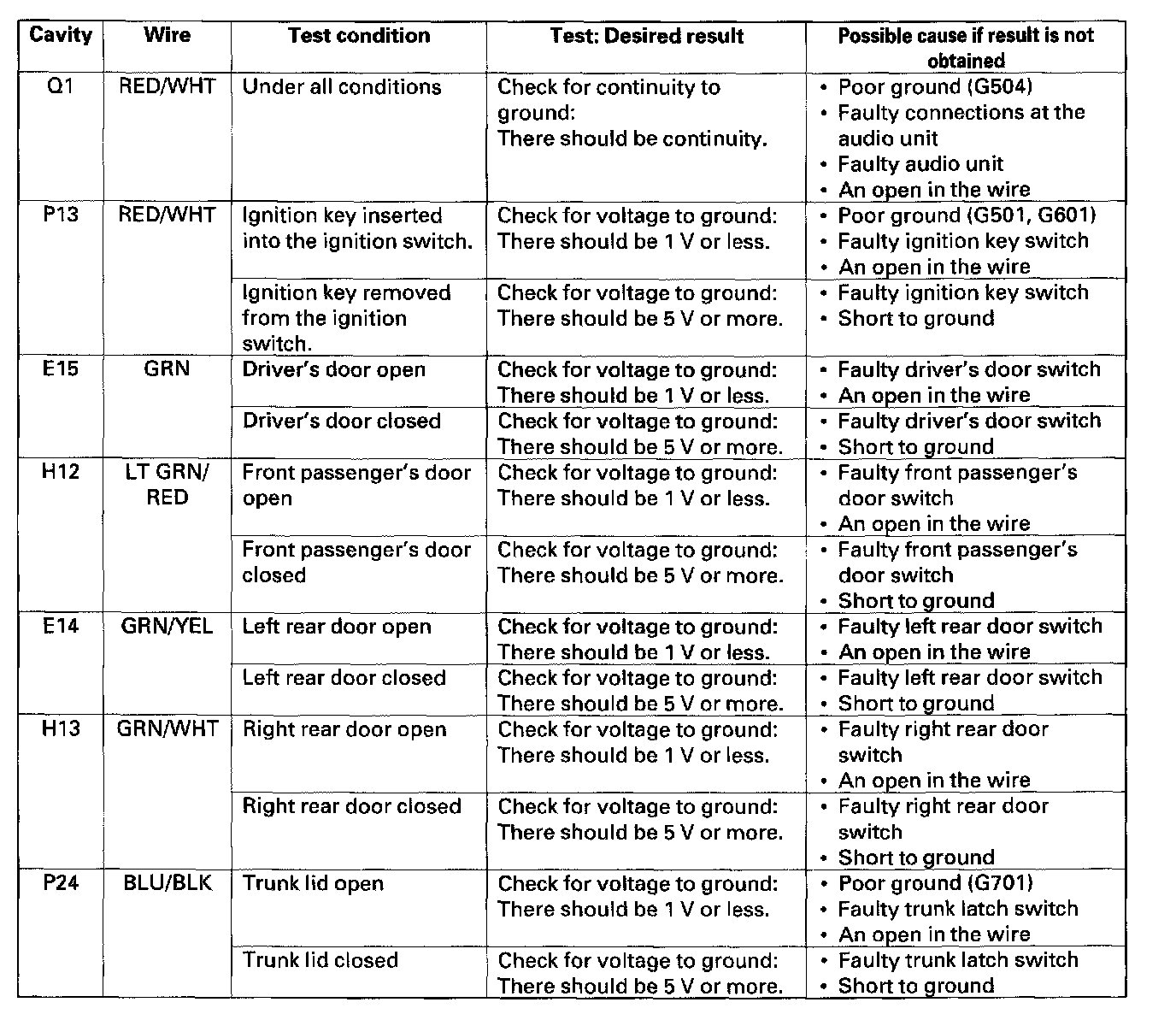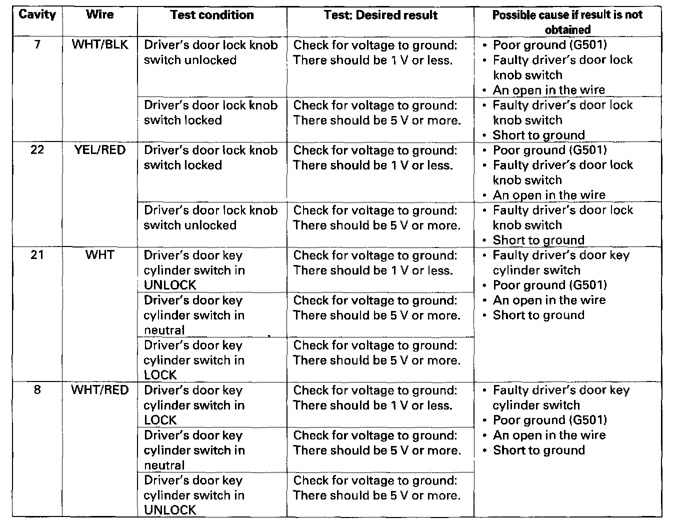 10. Reconnect the connector to the door multiplex control unit, and make these input tests at the connectors.