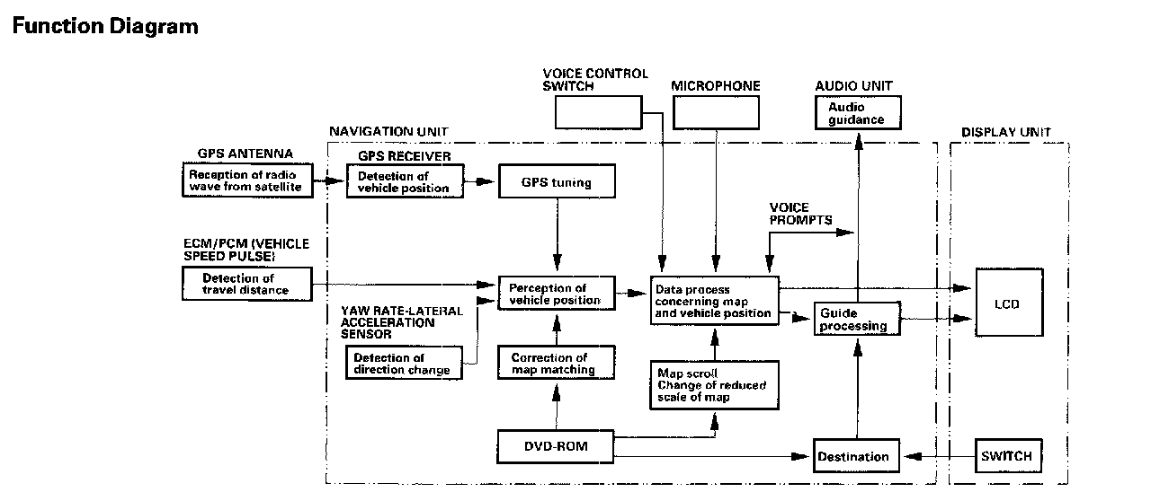 The navigation unit calculates the vehicle position and guides you to the destination. The unit performs map matching correction, GPS correction, and distance tuning. It also controls the menu functions and the DVD-ROM drive, and interprets voice commands. With control of all these items, the navigation unit makes the navigation picture signal, then it transmits the signal to the display unit and audio driving instructions to the audio unit.