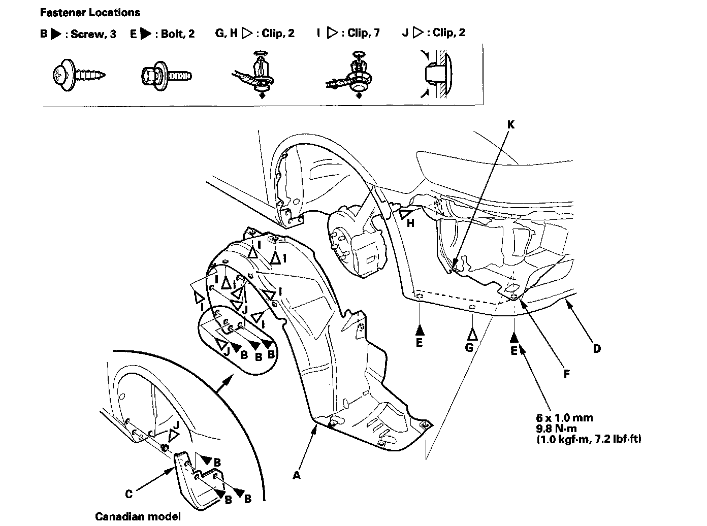 3. From the wheel arch, remove the clips (H, I, J) securing the front inner fender (and splash shield) on the body.