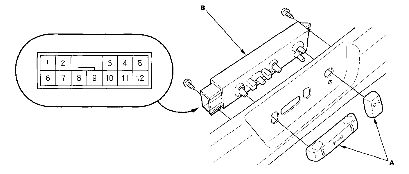 Switch Test/Replacement1. Remove the power seat adjustment switch knobs (A) and recline cover from the driver's power seat, then remove the two screws and the power seat switch.