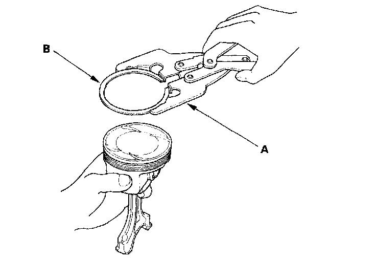 2. Using a ring expander (A), remove the old piston rings (B).