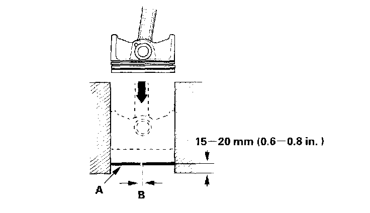 4. Using a piston, push a new ring (A) into the cylinder bore 15 - 20 mm (0.6 - 0.8 inch) from the bottom.