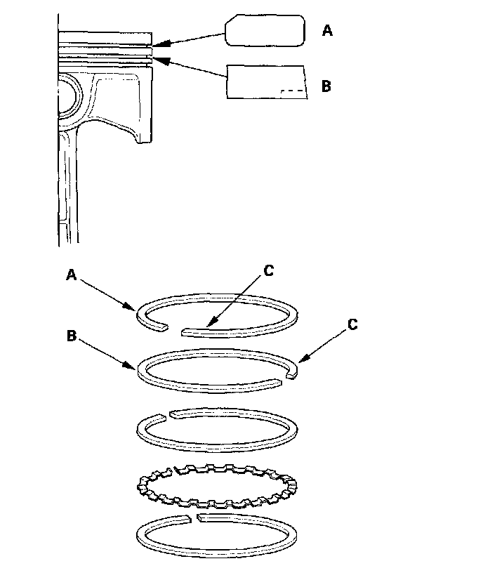 6. Install the top ring and second ring as shown. The top ring (A) has a 1R or 1N mark and the second ring (B) has a 2RN or 2N mark. The manufacturing marks (C) must be facing upward.