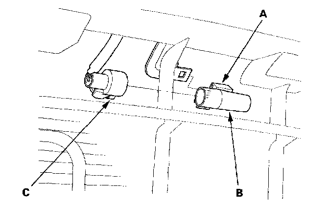 Outside Air Temperature Sensor Replacement1. Lift the tab (A) to release the lock, and remove the outside air temperature sensor (B) from the back of the front bumper beam. Disconnect the 2P connector (C) from the outside air temperature sensor.