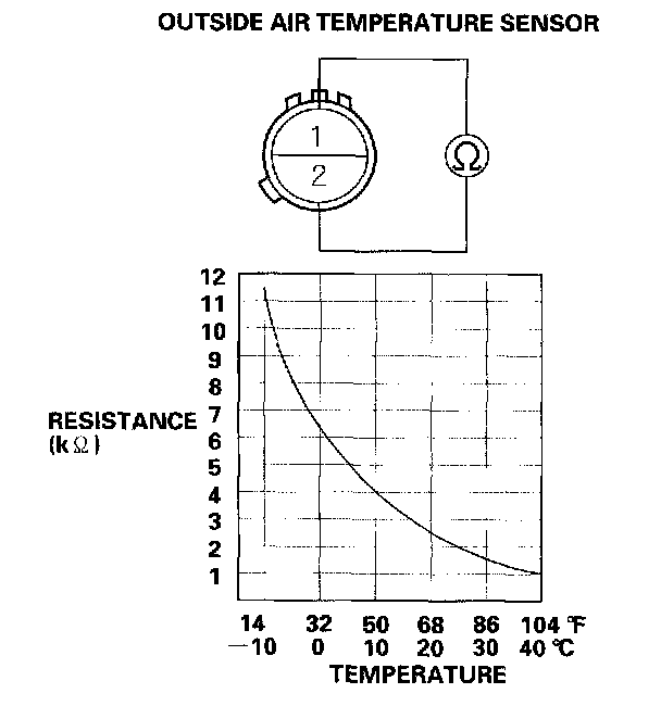 Compare the resistance reading between the No.1 and No.2 terminals of the outside air temperature sensor with the specifications shown in the graph; the resistance should be within the specifications.