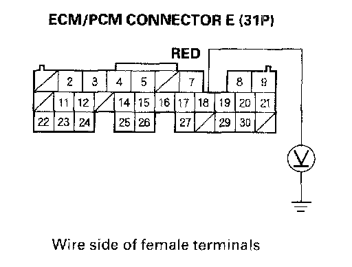 13. Using a backprobe set, measure the voltage between the No.18 terminal of ECM/PCM connector E (31P) and body ground with the ECM/PCM connectors connected.