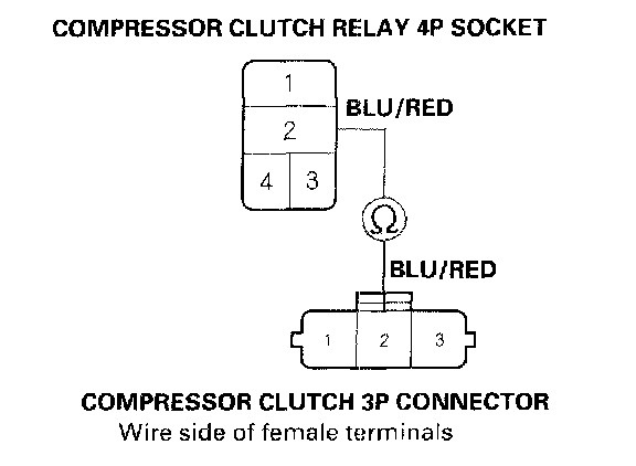 16. Check for continuity between the No.2 terminal of the compressor clutch relay 4P socket and the No.2 terminal of the compressor clutch 3P connector.