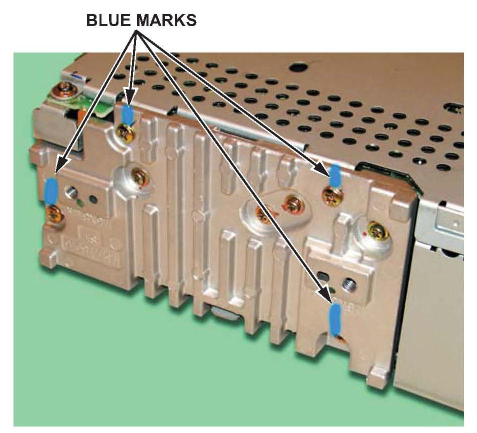 3. Using the blue marker, mark the four 3 x 8 mm screws on the audio unit's heat sink as shown. Then remove the four screws, and place them in the section of the screw container marked with the blue dot.