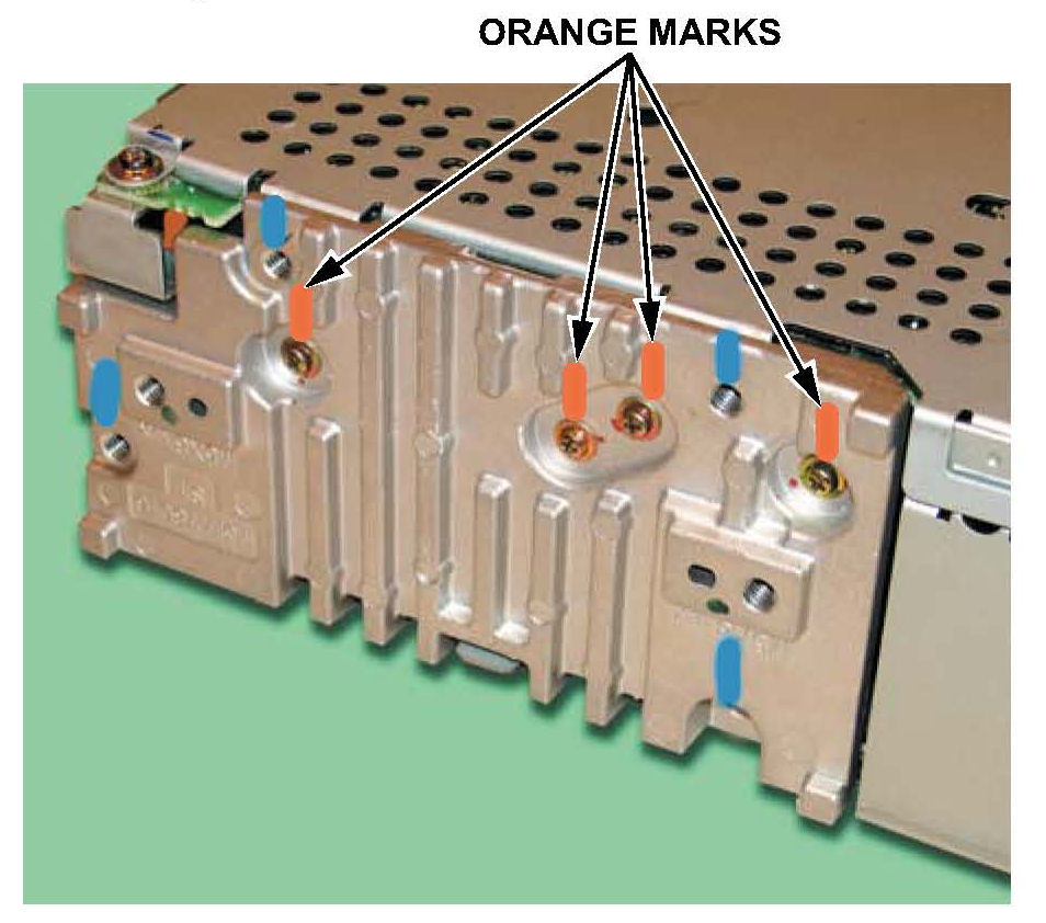 3. Using the orange marker, mark the three screws on the lower cover of the audio unit as shown. Then remove the three screws, and place them in the section of the screw container marked with the orange dot.