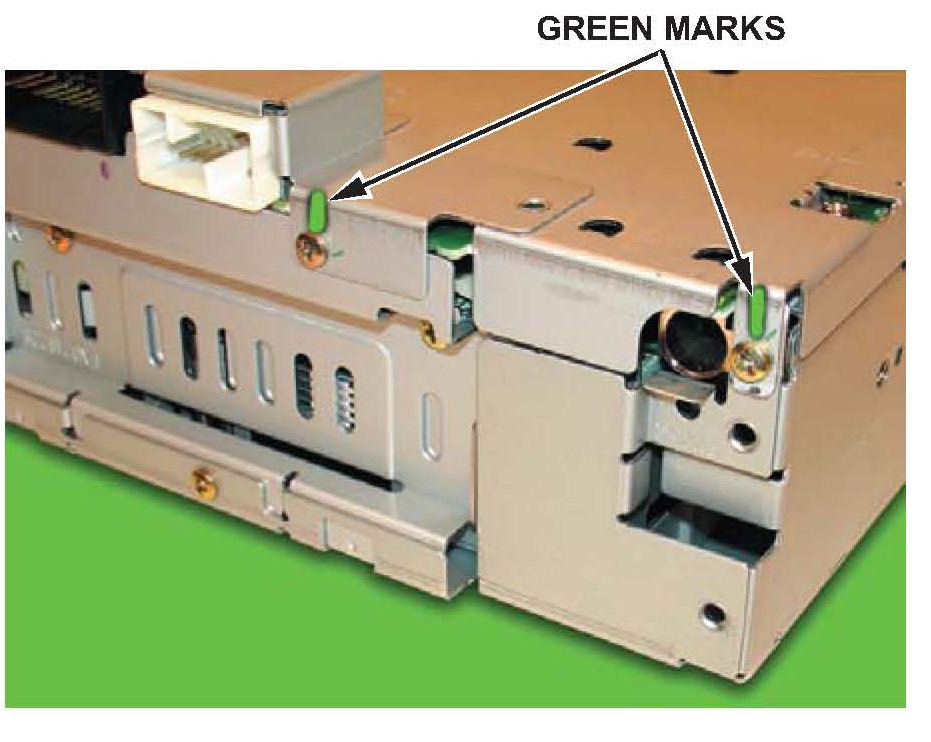 6. Using the green marker, mark the two screws on the back cover of the audio unit as shown. Then remove the two screws, and place them in the section of the screw container marked with the green dot.