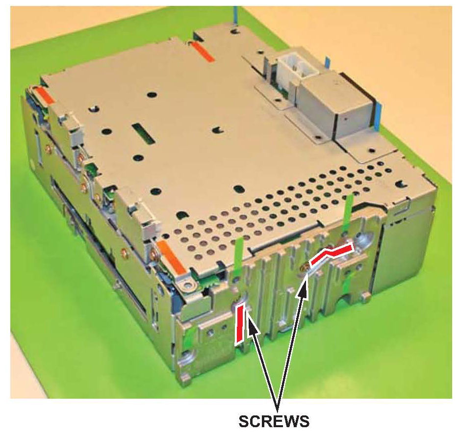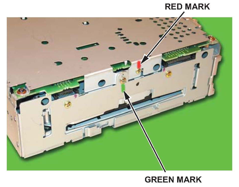 7. Using the green marker, mark the large screw on the front lower cover of the audio unit. Also, mark the small screw with the red marker. Then remove the two screws, and place them in the appropriate sections of the screw container marked with the green dot and the red dot.