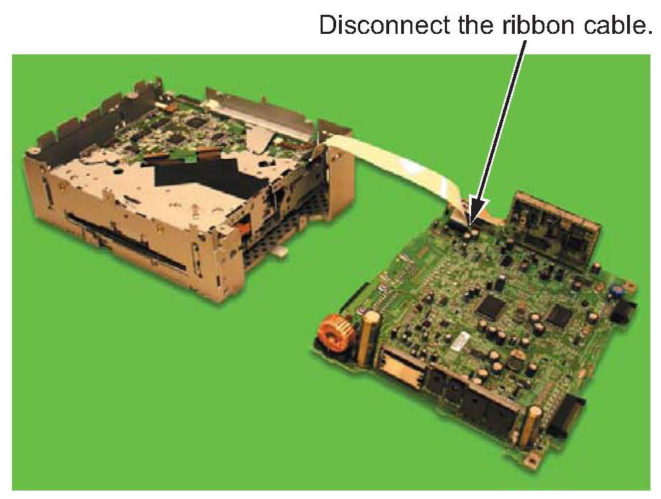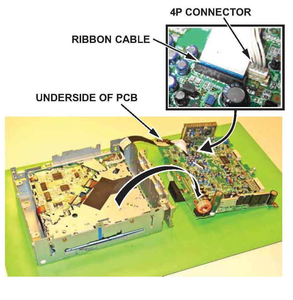 13. Set the PCB next to the audio unit on the ESD mat. Disconnect the ribbon cable and the 4P connector.